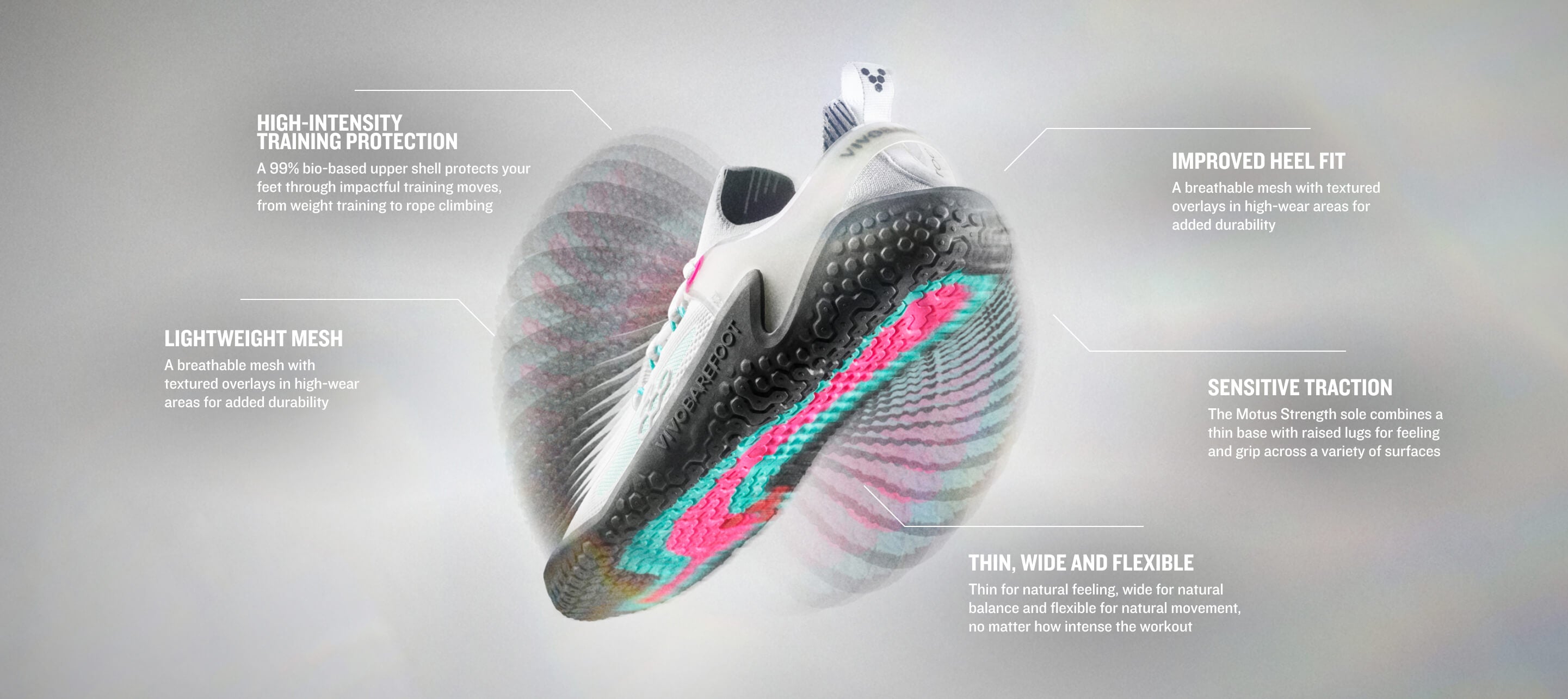 The Motus Strength Outsole is wide, thin and flexible for natural training mobility, and balances sensitivity, grip and durability for high-intensity workouts.